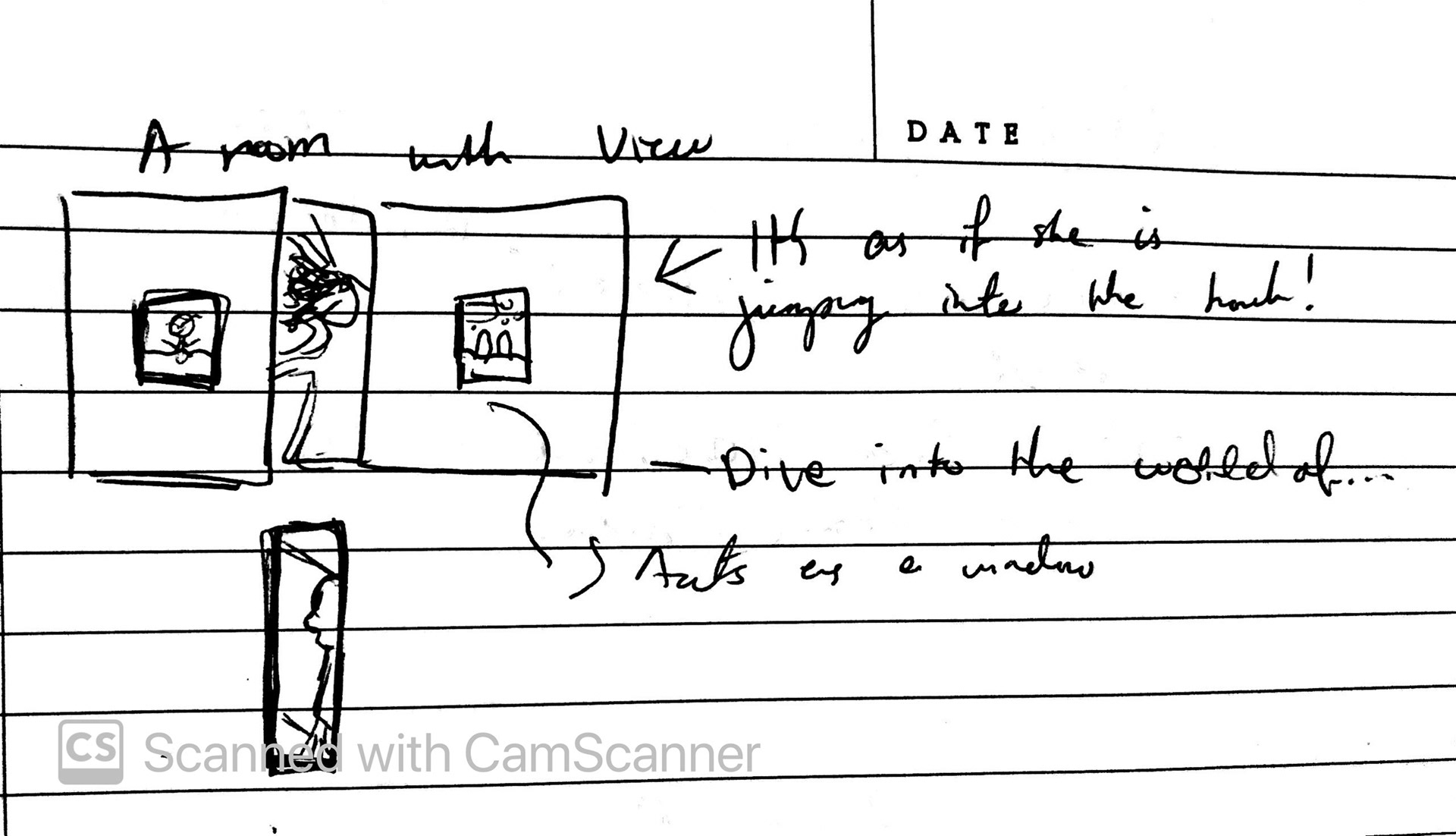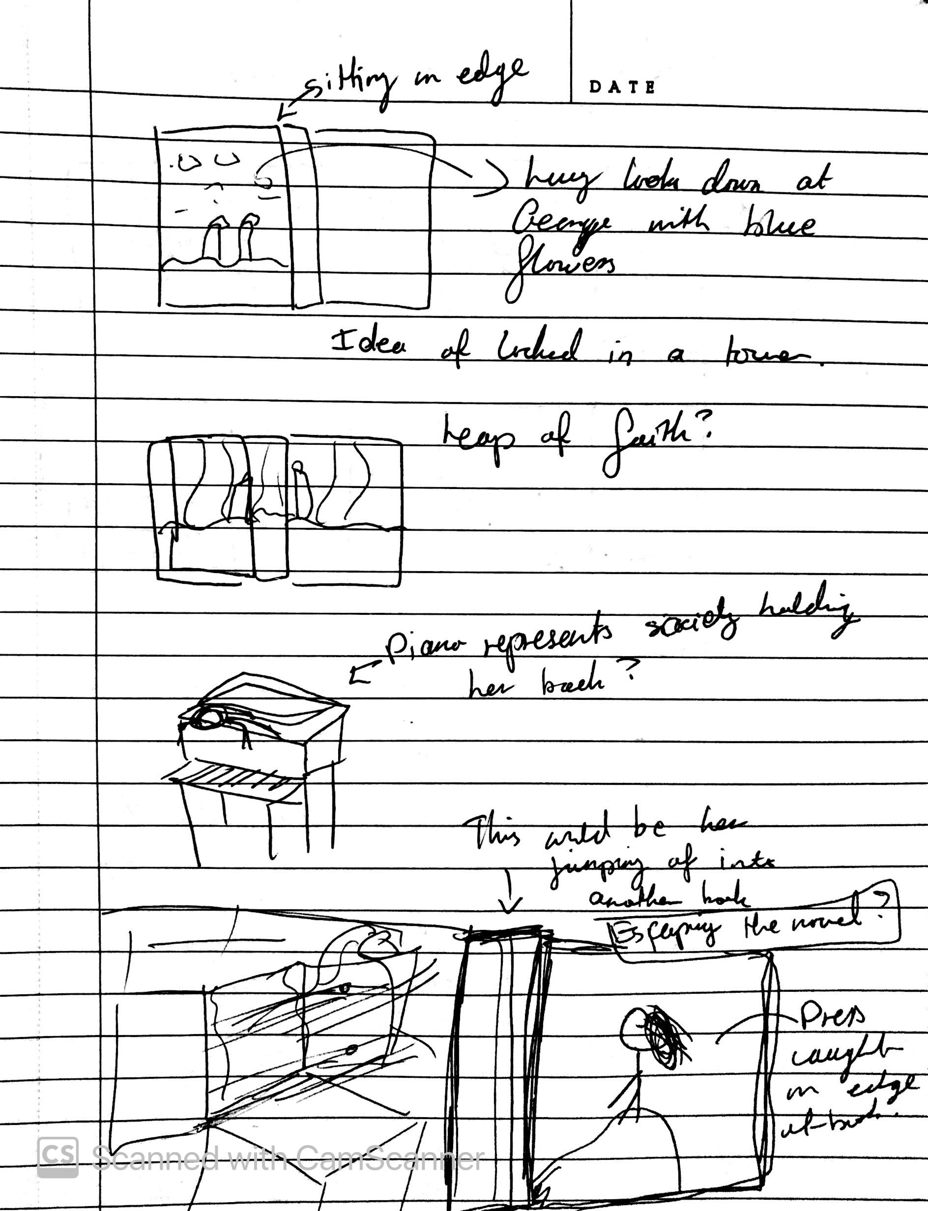 The negative space around her symbolises isolation as well as a safe space where she is confined to the traditions that society has implemented towards women of her status. However the flowers coming out of the piano, flowing towards the window represents how Lucy’s music is able to break the social barriers. The blue violets also represent George and how he is able to open her world in a different light.